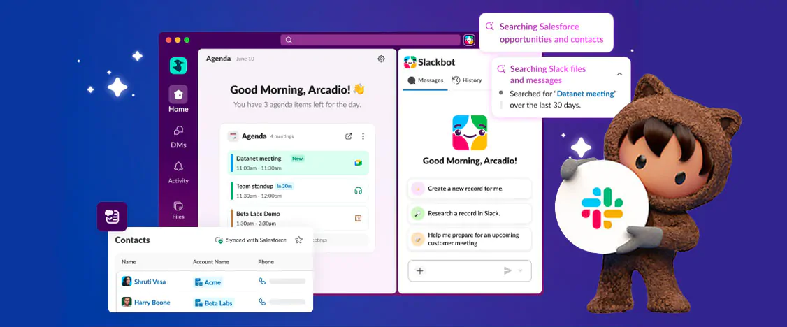 Two things are working together here. Slack CRM embeds Salesforce data natively into Slack so your contacts, deals, and activity history live alongside your conversations. No separate tab, no logging in. Slackbot is your personal AI agent for work built into Slack. It becomes the colleague who was in every meeting, read every thread, and never forgets a follow-up. Together, they change what day-to-day CRM work actually looks like.